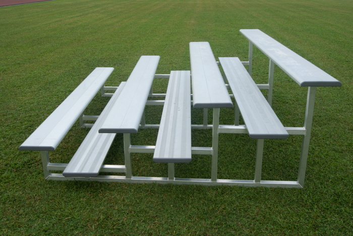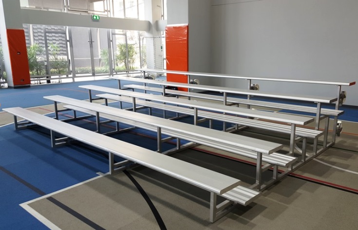 Our 4 row multi-use aluminium spectator stand is manufactured in the standard version with three levels of seats 3 metres long. There is ample space for up to 24 persons (6 persons per level). The different levels also guarantee a good view of the events taking place. The complete construction of our versatile spectator stand is manufactured from aluminium. The seating area and the steps are made from special aluminium profiles and are additionally anodised and treated to be non-slip.