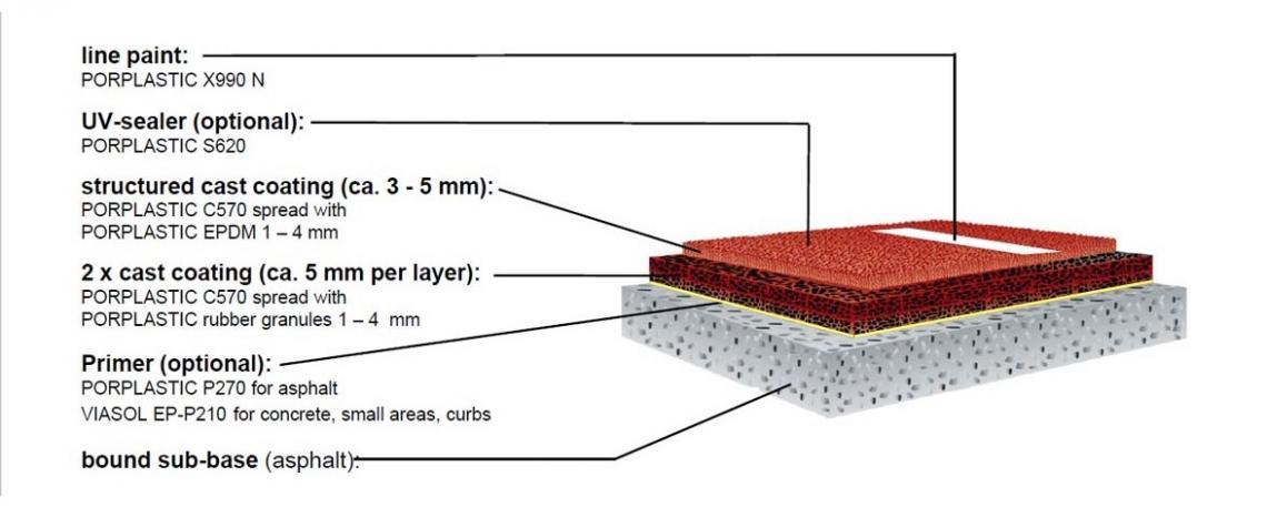 Massive, one or multilayer full PU-bound system spread with colored EPDM granules, water-impermeable